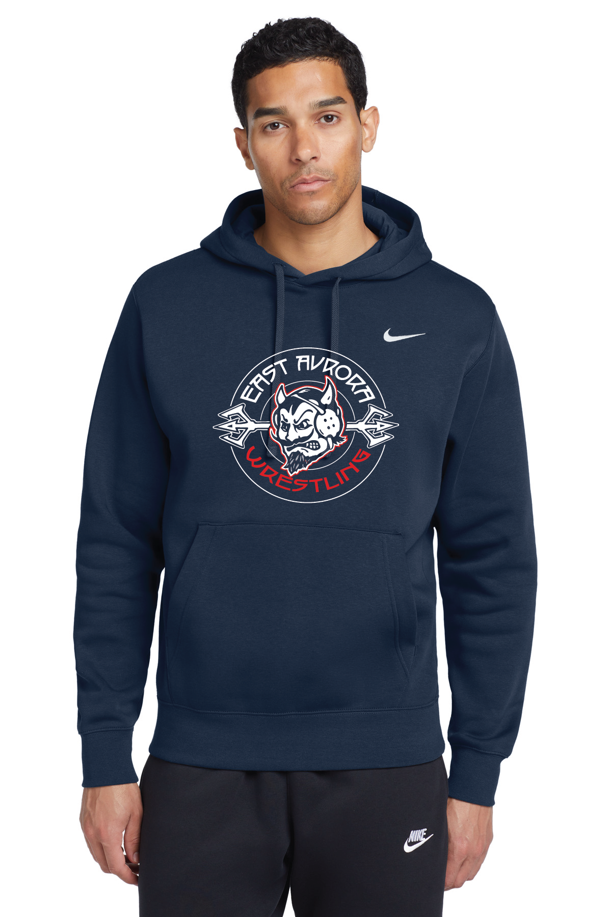 A closet staple, this hoodie combines classic Nike style with the soft comfort of brushed-back fleece. A jersey-lined, 3-panel hood with dyed-to-match drawstrings offers adjustable coverage. Rib knit cuffs and hem. Front pouch pocket. A contrast Swoosh design trademark is embroidered on left chest. Made of 8.2-ounce, 80/20 cotton/polyester with a 100% cotton hood lining.